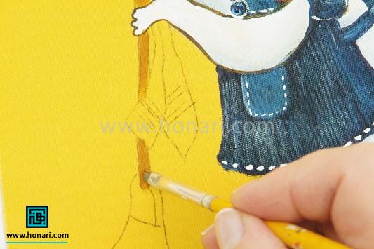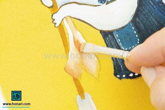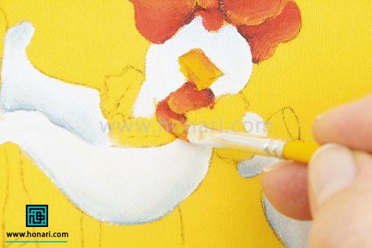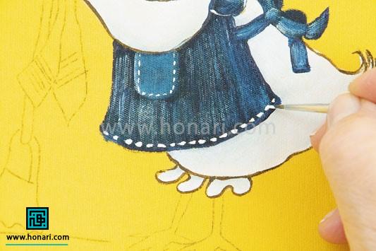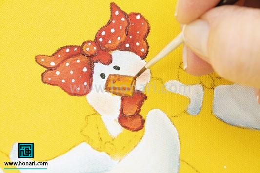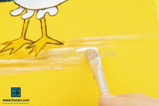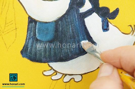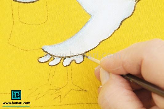 مقداری رنگ سفید را با سر قلمموی شماره ۶ برمیداریم و به صورت چرخشی، پارچهای را که در دست مرغ است رنگ میزنیم.