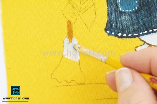 بعد با همان قلممو و کمی رنگ کاراملی، کنارههای پارچه را سایهدار میکنیم.