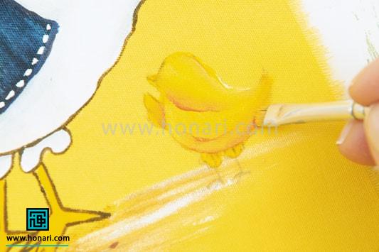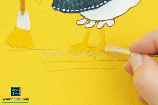 خب، بیایید آموزش نقاشی روی پارچه را ادامه دهیم. نوک قلم موی شماره ۲ را کمی به رنگ زرد آغشته کنید و بخشهای بیرونی تاج و زیر گلوی پرنده را با آن به آرامی سایه بزنید تا حالت برجسته و حجمدار پیدا کند.