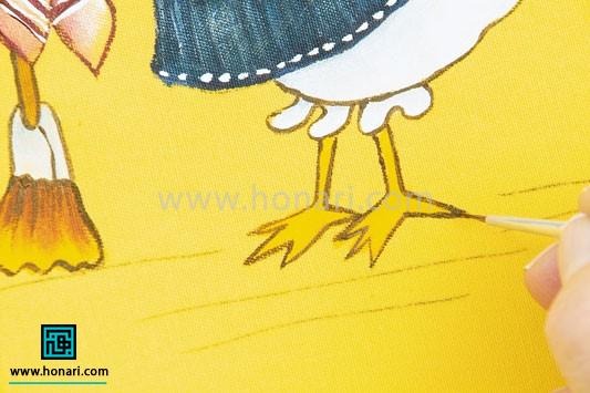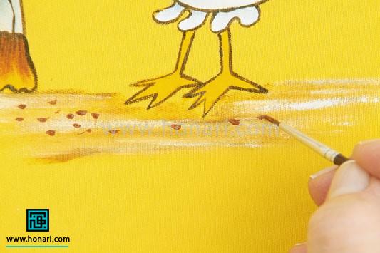 با استفاده از قلم موی خیلی نازک و رنگ قهوهای، دور تا دور پاهای مرغ را خط میکشیم. این کار باعث میشود شکل و جزئیات پاها به خوبی دیده شود.