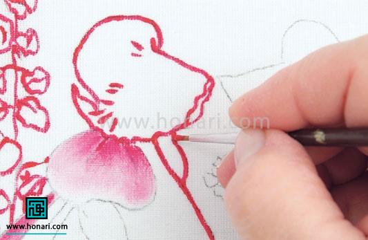 برای مرحله بعدی نقاشی روی پارچه، از یک قلم موی خیلی نازک با شماره صفر و رنگ صورتی روشن استفاده میکنیم. با این قلم مو، به آرامی تمام خطوط دور هر گل را رنگ میزنیم و دقت میکنیم که همهی این خطوط به خوبی و کامل پوشانده شوند.