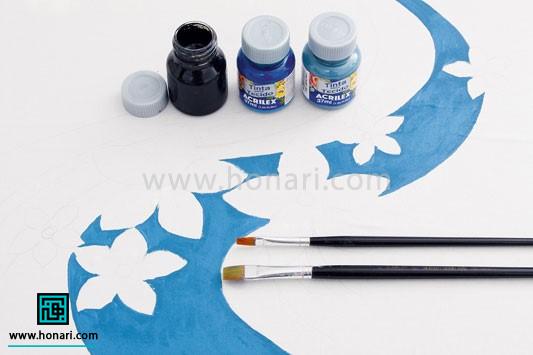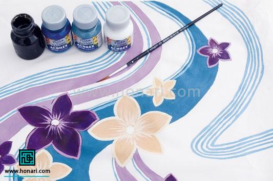 در این بخش از کار، با استفاده از یک قلم موی نازک (سایز ۲) و رنگی که از ترکیب چند رنگ به دست آوردهایم، روی پارچه طرح میزنیم.