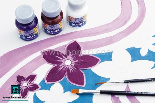 در این قسمت از کار، برای رنگآمیزی گلهای بنفش، ابتدا باید رنگ شرابی و بنفش را به نسبت دو برابر شرابی و یک برابر بنفش با هم ترکیب کنیم.