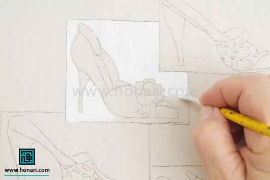 با یک قلمموی شماره ۶ و رنگ سفید، مطابق تصویر، داخل مستطیل و دور کفش را با حرکتهای دایرهای رنگ میکنیم.