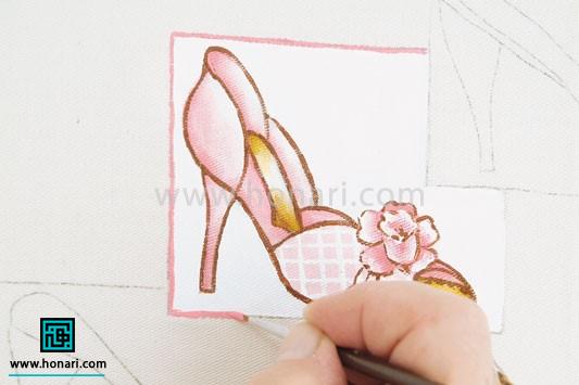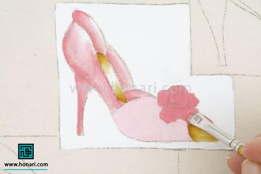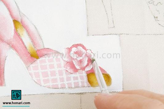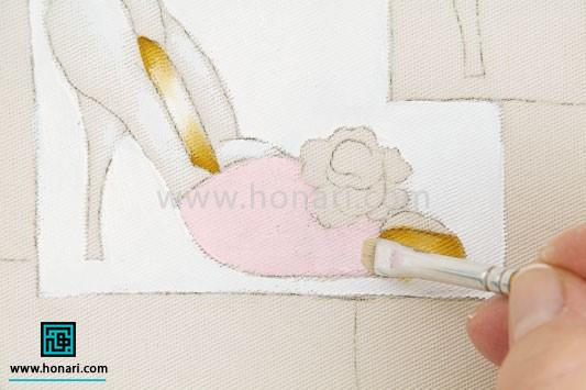 در مرحله بعدی از طراحی روی پارچه، با استفاده از رنگ صورتی روشن و یک قلم موی شماره ۶، لبههای بیرونی نوار روی کفش را به آرامی رنگ میزنیم.