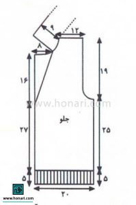 **پشت:** با ۹۴ دانه شروع میکنیم و ۵ سانتیمتر به روش یک زیر، یک رو (کشباف) میبافیم. سپس تعداد دانهها را کم کرده و به ۸۲ دانه میرسانیم. بعد از آن، طبق نقشه، ۲۵ سانتیمتر ادامه میدهیم. برای قسمت حلقه آستین، از دو طرف کار به ترتیب ۱، ۲ و ۳ دانه میبندیم. وقتی قد کار به ۴۹ سانتیمتر رسید، همه دانههای باقیمانده را یکجا میبندیم.