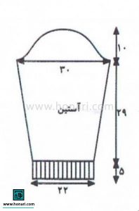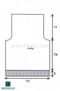 **آستین:** با ۵۴ دانه شروع میکنیم و ۵ سانتیمتر به روش یک زیر، یک رو (کشباف) میبافیم. طبق نقشه، از دو طرف کار در هر رج یک دانه اضافه میکنیم و ۲۹ سانتیمتر میبافیم. برای تشکیل حلقه آستین، ابتدا ۲ و سپس ۳ دانه میبندیم. بعد از آن، ۱۰ بار و در هر نوبت یک دانه کم میکنیم. در پایان، همه دانههای باقیمانده را با هم میبندیم.