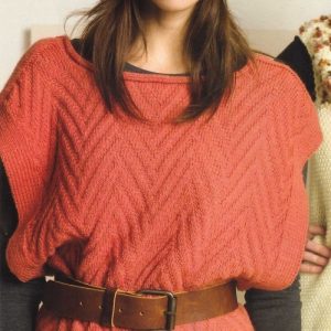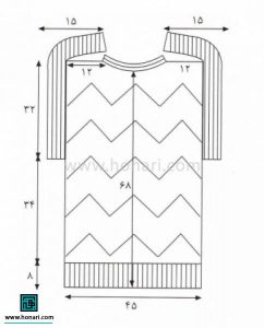برای قسمت سجاف و لبه آستین، از هر دو طرف ۱۶ دانه اضافه کنید و با روش بافت یک رو یک زیر ادامه دهید. وقتی قد کار به ۶۸ سانتیمتر رسید، ۳۲ دانه از وسط را ببندید. در رجهای بعدی، از دو طرف این ۳۲ دانه، به ترتیب ۶ و ۸ دانه دیگر کم کنید.