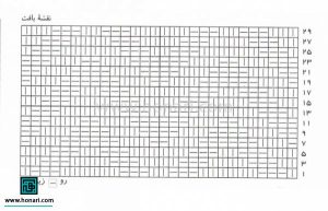 با استفاده از نخ لاناگلد فاین به رنگ مرجان، ۱۲۰ دانه سر بیندازید. سپس به مدت ۸ سانتیمتر با روش بافت کشباف (یک دانه از رو، یک دانه از زیر) کار خود را ادامه دهید. پس از آن، نقشه اصلی بافت را شروع کرده و تا زمانی که طول کار به ۳۴ سانتیمتر برسد، ادامه دهید.