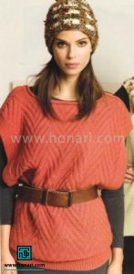 دو دانه از رنگ 51295 را بدون بافتن بردارید. سپس پنج دانه را به روش زیر ببافید، بعد دو دانه را بدون بافتن بردارید، دوباره پنج دانه زیر ببافید، دو دانه را بدون بافتن بردارید، پنج دانه زیر ببافید، دو دانه را بدون بافتن بردارید و رج را تمام کنید. این روش را برای سه رج تکرار کنید. با نخ 51295، سه رج را به صورت رکن ببافید و سپس ۱۸ سانتیمتر را مانند مرحله قبل ادامه دهید. بعد از پنج جعبه، دانهها را دو تا دو تا با هم بگیرید و ببافید. وقتی ۱۰ دانه باقی ماند، یک نخ از داخل آنها رد کنید و کلاه را فرم دهید. در انتها یک منگوله به بالای کلاه وصل کنید.