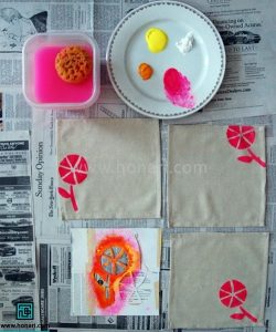 بعد از آماده شدن قالب، رنگ مورد علاقه خود را روی سطح برجسته بمالید. می‌توانید از رنگ‌های مختلف استفاده کنید تا گل شما جلوه زیباتری داشته باشد. حالا قالب را بردارید و آن را به آرامی روی کاغذ یا پارچه مورد نظر فشار دهید. دقت کنید که فشار به صورت یکنواخت باشد تا تمام جزئیات طرح منتقل شود.