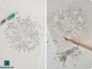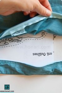 اول، شکلی که دوست دارید روی پارچه کوسن داشته باشید را روی یک کاغذ بکشید. سپس، این طرح را به یک صفحه طلقی (شفاف) منتقل کنید.