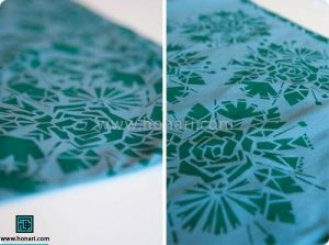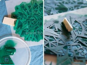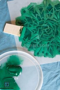 طرح را در جای درست خود قرار میدهیم و آن را محکم میکنیم. سپس با استفاده از اسفنج یا قلموی مخصوص، شروع به رنگآمیزی طرح میکنیم.