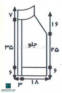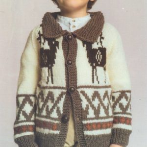 **آستین:** با نخ به رنگ قهوه‌ای، ۳۶ دانه سر می‌اندازیم. سپس به مدت ۶ سانتی‌متر با روش بافت ۱ رو و ۱ زیر (کشباف) کار را ادامه می‌دهیم. بعد از آن، با نخ کرم رنگ، ۵ رج به صورت ساده می‌بافیم و پس از آن، نقشه شماره ۱ را شروع می‌کنیم.