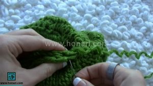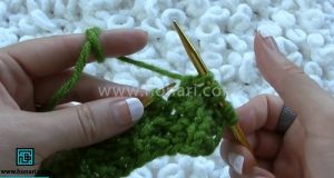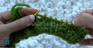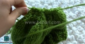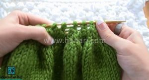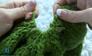 حالا دوباره همه دونهها را از رو ببافید. این کار را برای ۵ تا ۶ سانتیمتر ادامه دهید. اگر دوست دارید، میتوانید یک طرح زیبا مثل پیچ هم روی این قسمت ایجاد کنید.