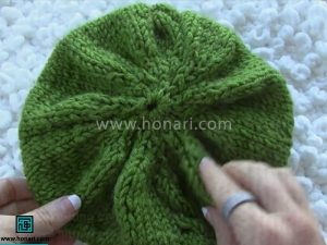 ردف بعدی را تماماً از روی ببافید. در ردف بعد، بعد از هر ۶ دانه، یک دانه اضافه نمایید. در ردیفهای برگشت نیز تمام بافت را از روی ادامه دهید. سپس در ردیفهای رفت، بین هر ۷ دانه و بعد از هر ۸ دانه، یک دانه بیفزایید. (اگر کلاه را با طرح خاصی میبافید، فقط در ابتدا و انتهای هر ردیف، دانهها را اضافه کنید.)