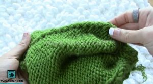 حالا دوباره همه دونهها را از رو ببافید. این کار را برای ۵ تا ۶ سانتیمتر ادامه دهید. اگر دوست دارید، میتوانید یک طرح زیبا مثل پیچ هم روی این قسمت ایجاد کنید.