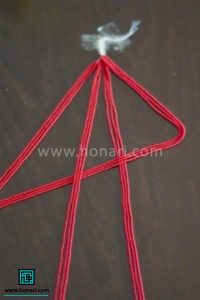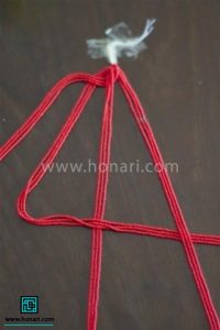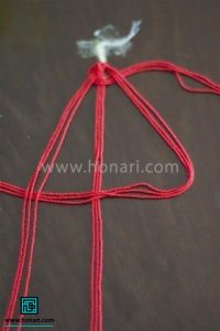 دسته اول از سمت راست را به حالت یکی از رو و یکی از زیر، از بین رشتههای کناری عبور میدهیم.