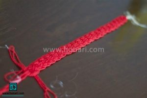 در مرحله بعد، نخستین رشتهای که از سمت چپ قرار دارد را به صورت رو و زیر از بین رشتههای کناری خارج میکنیم.