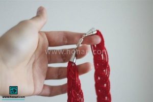 کار ساخت گردنبند در این مرحله به پایان میرسد. حالا فقط کافی است دو سر نخها را به خوبی گره بزنید.