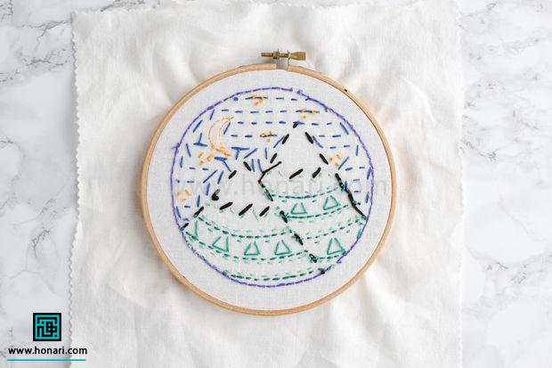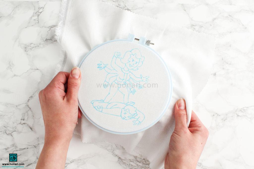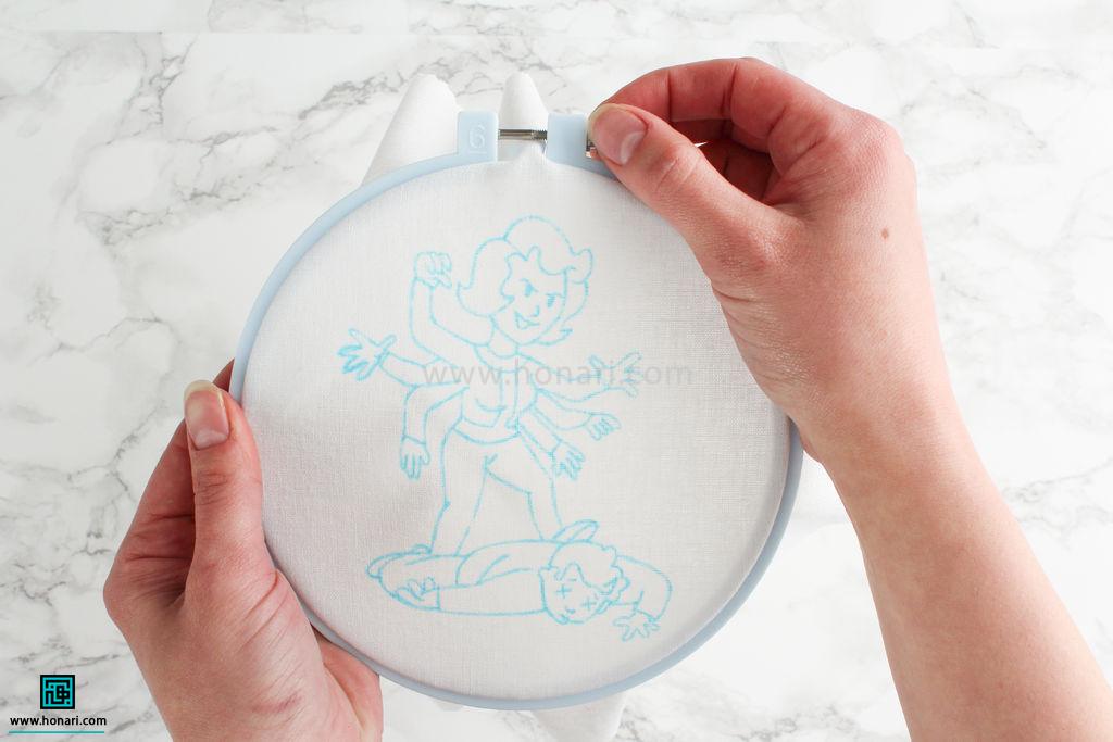 اگر کارگاه شما به قدری بزرگ است که همه‌ی طرح را در خود جای می‌دهد، می‌توانید پارچه را داخل آن نگه دارید؛ اما بهتر است وقتی دوخت تمام شد، کشش پارچه را کمی کمتر کنید.