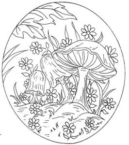در این طرح، معمولاً قارچهایی با کلاهکهای قرمز و سفید دیده میشوند که نقطههای سفید روی کلاهک قرمزشان، آنها را شبیه به قارچهای افسانهای میکند. کنار این قارچها، گیاهان کوچک، برگها و گاهی حلقههای قارچی دیده میشوند که همه با هم یک منظره زنده و شاد از جنگل را به نمایش میگذارند.