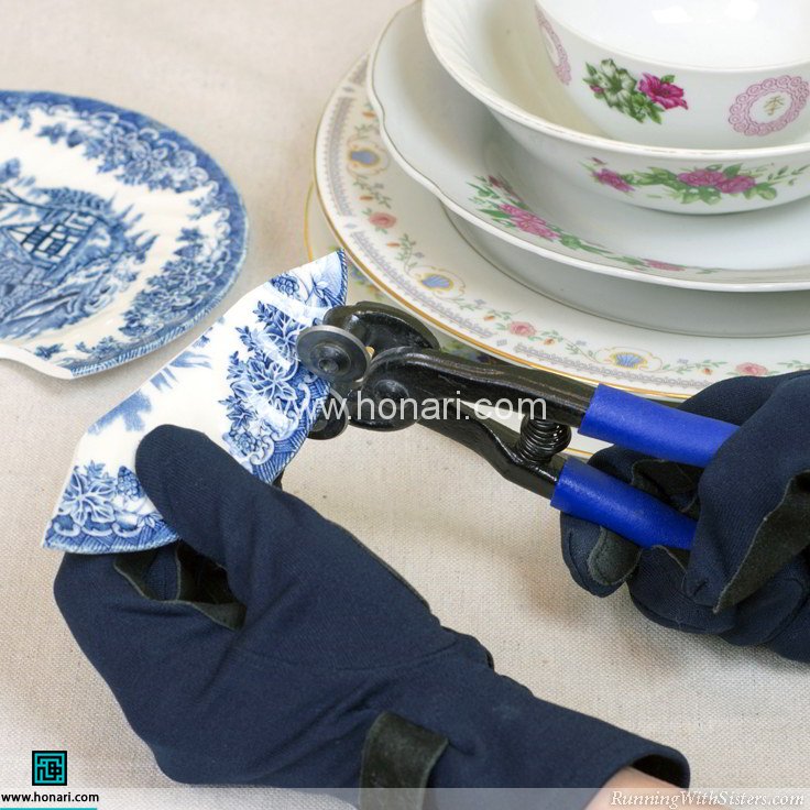 ابتدا ظرف چینی یا کاشیها را با کمک انبر به تکههای کوچک خرد کنید.