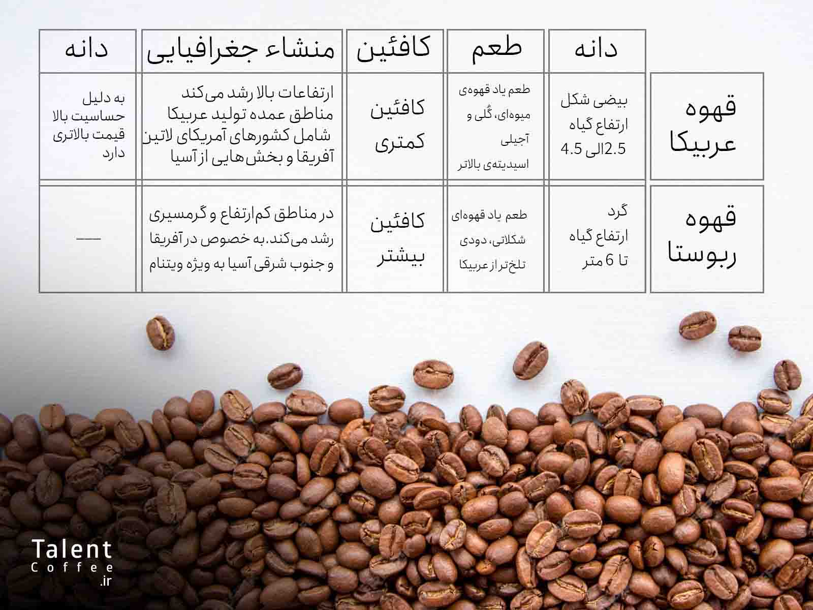 **تفاوت در شکل دانه، طعم، کافئین، منطقه کشت، قیمت و موارد استفاده**