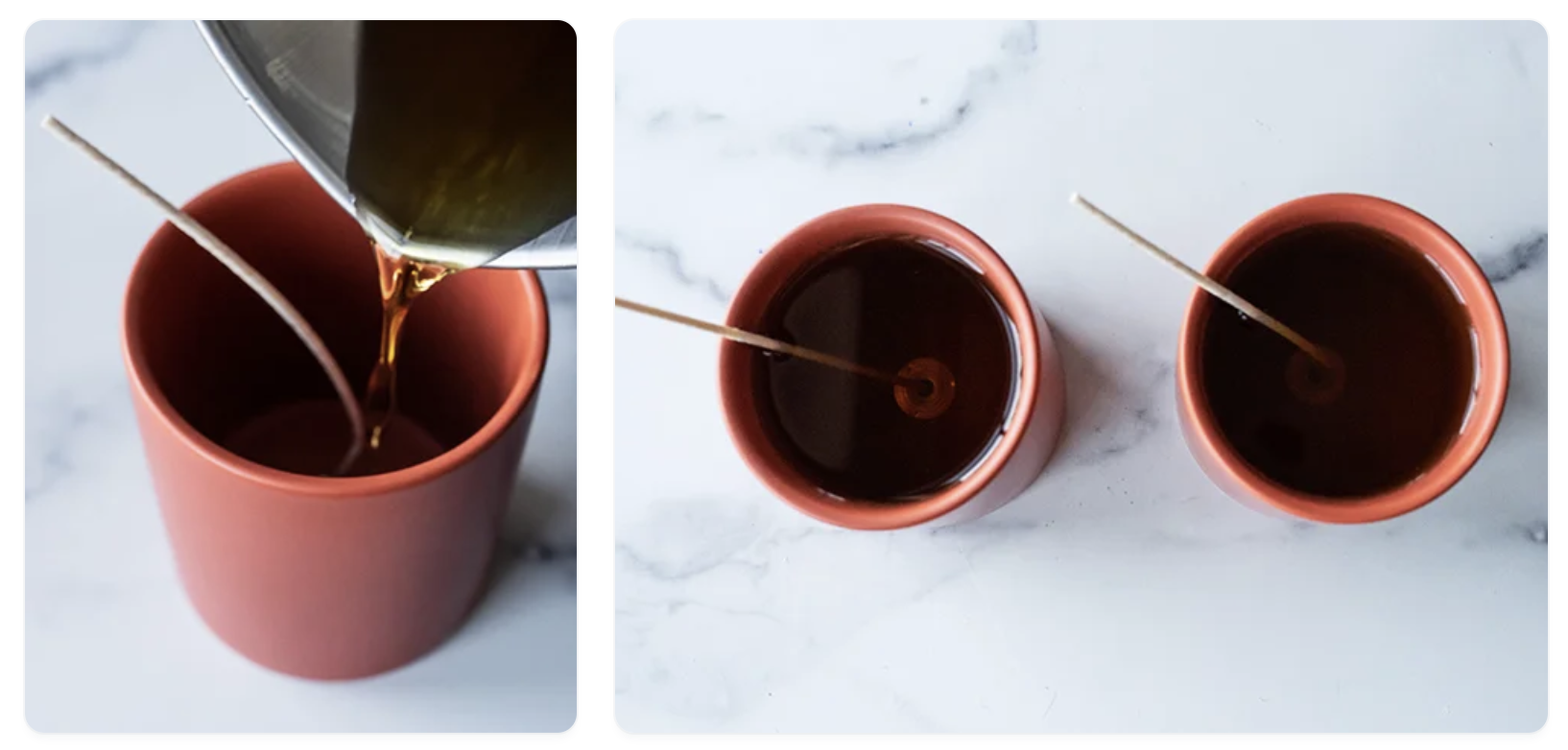 بعد از اینکه اسانس و پارافین را با هم مخلوط کردید، مخلوط را به آرامی داخل ظرف شیشهای بریزید. در طول این کار دقت کنید که فتیله در وسط ظرف ثابت بماند.