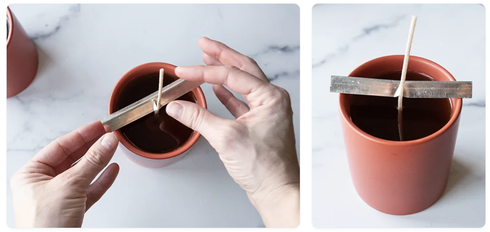 ابتدا فتیله را با چسب به ته ظرف شمع ثابت کنید. دقت کنید که فتیله دقیقاً در وسط ظرف قرار گرفته باشد. برای اینکه فتیله در مرکز ثابت بماند، میتوانید از یک نگهدارنده فتیله استفاده کنید؛ فتیله را به آن گره بزنید و سپس آن را روی ظرف قرار دهید.