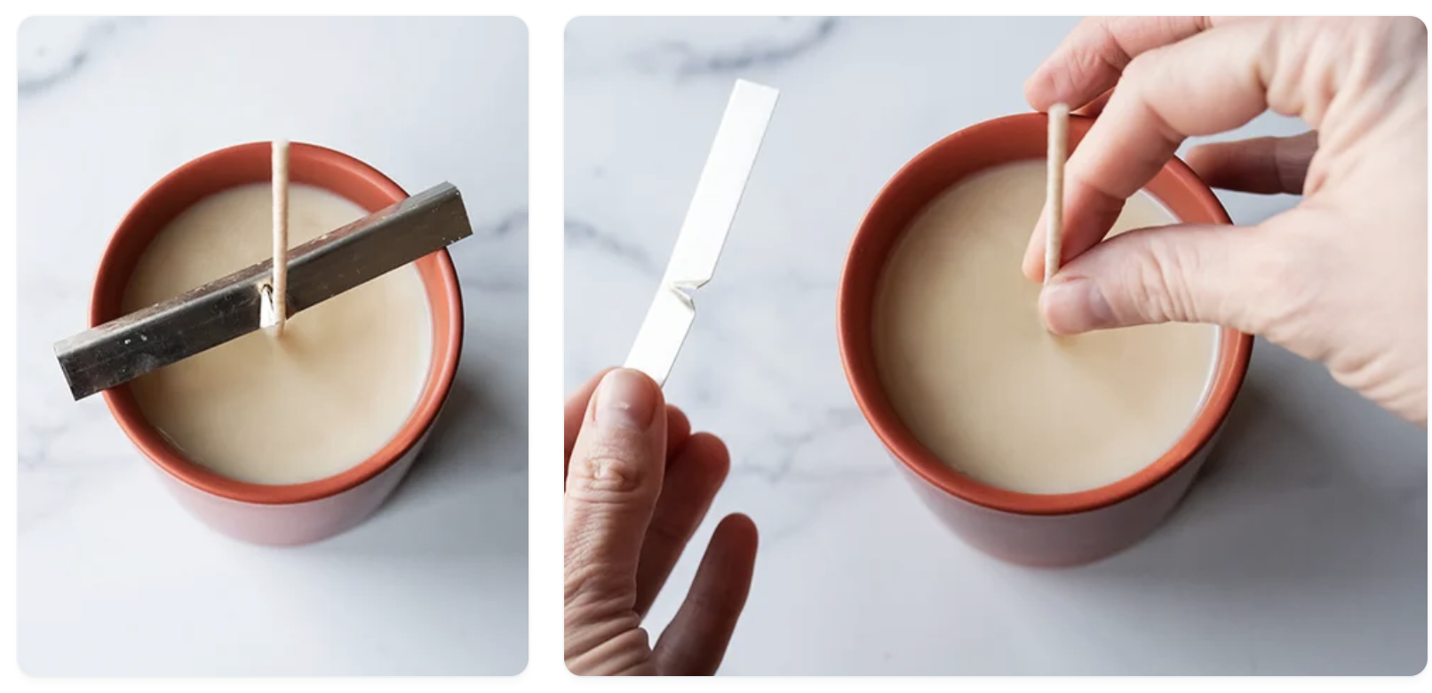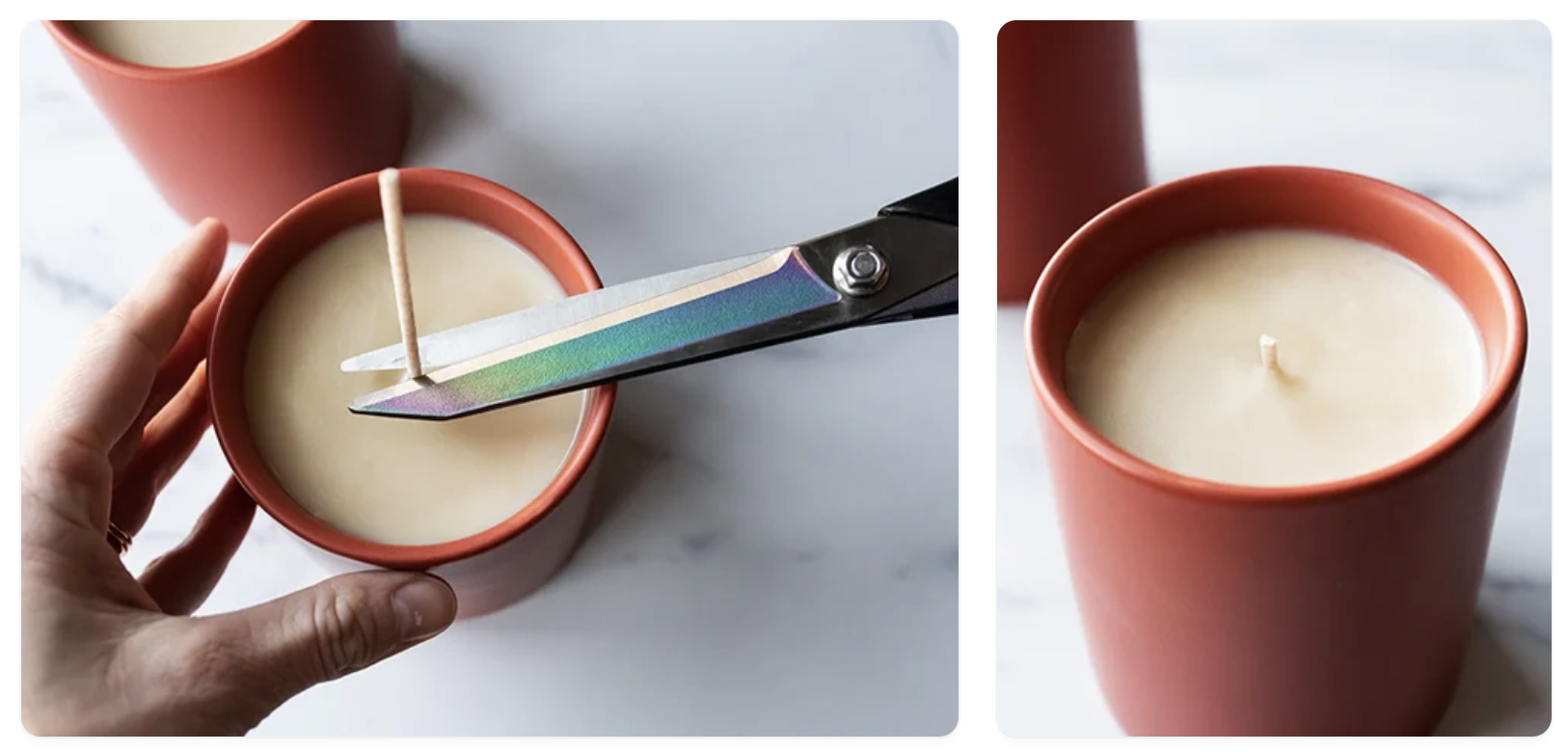 پس از سفت شدن کامل شمع، فتیله آن را به طول تقریبی یک تا یک و نیم سانتیمتر کوتاه کنید. اگر فتیله بیش از اندازه بلند باشد، باعث تولید دود و سوختن زودرس شمع خواهد شد.