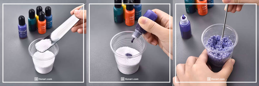 سپس چند قطره از رنگ مایع را به آن اضافه کنید (برای شروع، مقدار کمتری بریزید).