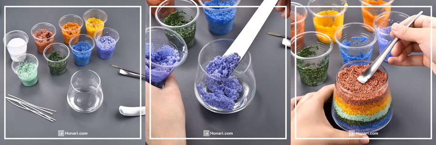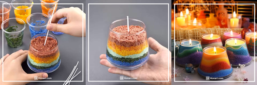 ریختن پودر شمع: پودر شمع رنگی یا ساده را به آرامی داخل ظرف بریزید تا کاملاً پر شود. اگر دوست دارید شمعتان جلوه بهتری داشته باشد، میتوانید پودرهای رنگی مختلف را لایه لایه بریزید.