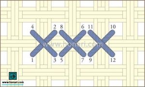 روش دوخت به صورت رفت و برگشتی انجام میشود و در پایان، نقشِ ضربدری شکل میگیرد.