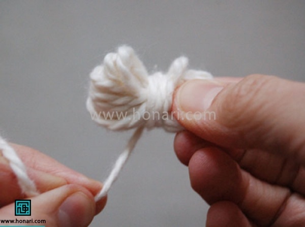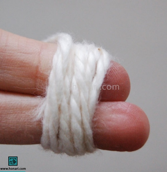 برای درست کردن دم خرگوش، نخ سفید را چند بار دور دو انگشت دستتان بپیچید.