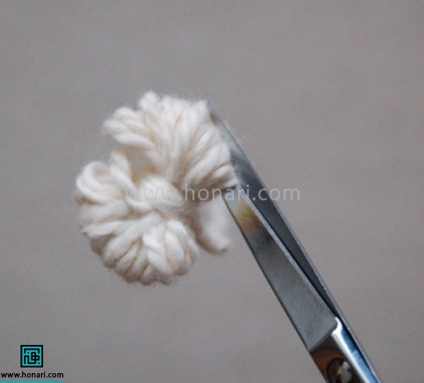 در این مرحله، با کمک نخ سفید مخصوص عمامه یا نخ کوبلن سفید، برای عروسک خرگوشی که روی انگشت قرار می‌گیرد، سبیل درست می‌کنیم.