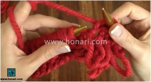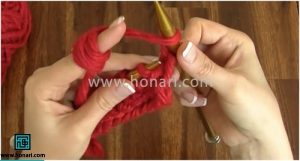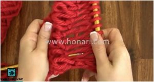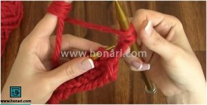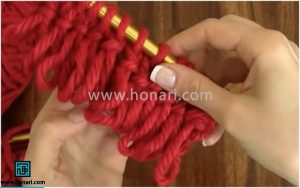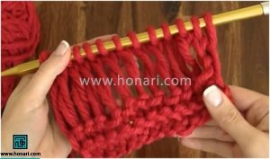 دانه دوم را از قسمت زیرین کار میبافیم. سپس نخ را سه بار دور میل میپیچیم. بعد از آن، دانه سوم را میبافیم. این روش را تا آخرین دانه رج ادامه میدهیم: پس از بافتن هر دانه، نخ را سه بار به دور میل میپیچیم و بعد دانه بعدی را میبافیم.