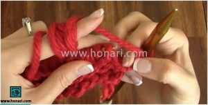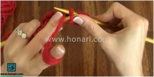 دانه اول را بدون بافتن رد میکنیم. سپس نخهایی که قبلاً به دور میل پیچیده بودیم، آزاد میکنیم. بعد از آن، دانه دوم را از زیر میبافیم. دوباره نخهای پیچیده شده را آزاد میکنیم و سپس دانه سوم را میبافیم.