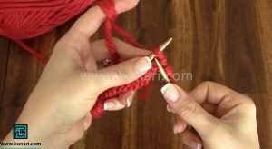 – دانه اول را معمولی ببافید (توجه کنید: فقط در همین ردیف اول، دانه اول بافته میشود. در ردیفهای بعدی، دانه اول را بدون بافتن به میل دیگر منتقل میکنیم).