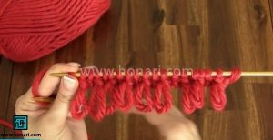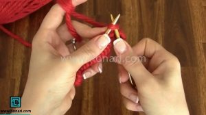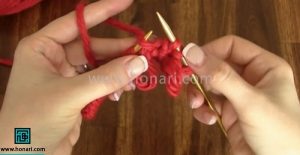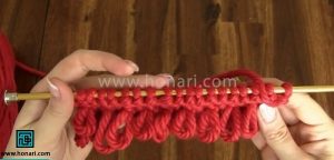 – دانههایی که شماره زوج دارند (مثل دانه دوم، چهارم، ششم و…) را با روش متفاوتی ببافید: میل را همانطور که در تصویر نشان داده شده، از پشت به داخل دانه وارد کنید و سپس آن را ببافید.