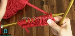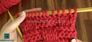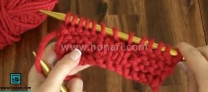 رج سوم: دانههایی که در رج قبلی پشت بافته شده بودند را این بار رو ببافید و برعکس، دانههایی که رو بافته شده بودند را این بار پشت ببافید.