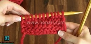 برای بافت، طوری عمل کنید که دانههای مربوط به قسمت پیچ در زیر کار قرار بگیرند و دانههای سمت چپ و راست آن به رو بافت شوند.