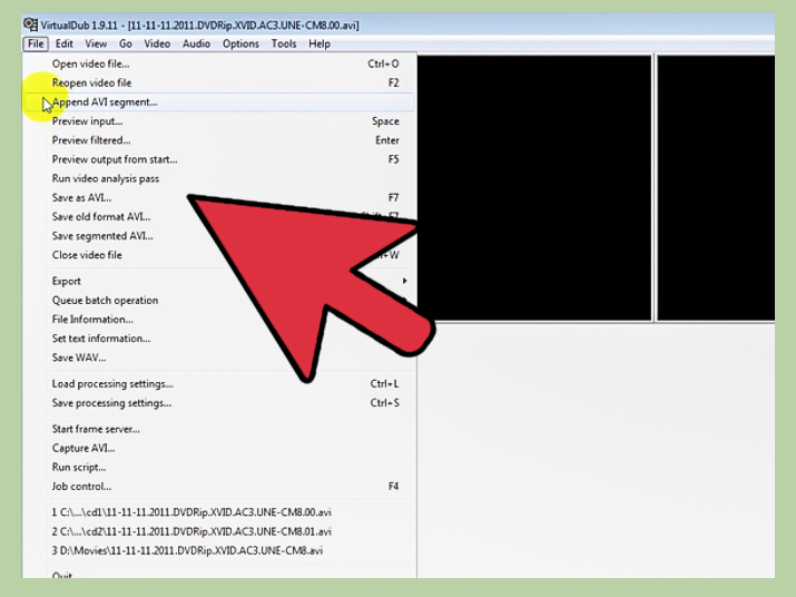 به بخش **File** بروید و گزینهی **Append AVI Segment** را انتخاب کنید. با این کار، پنجرهی انتخاب فایل دوباره باز میشود و شما میتوانید فایل ویدیویی دوم خود را انتخاب کنید.