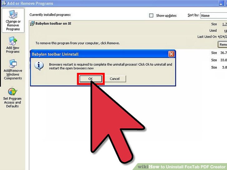 ۶. در نوار ابزار، هنگام پاک کردن برنامه Babylon، روی گزینه تأیید (OK) کلیک کنید.