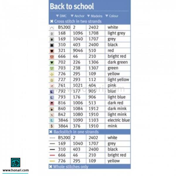 در هر نقشه، رنگهای مختلف با استفاده از حروف انگلیسی یا نمادهای خاصی از هم جدا شدهاند. در قسمت پایین نقشه نیز یک راهنما وجود دارد که در آن، هر رنگ یا علامت به شمارهی نخ مخصوص خودش وصل شده است. این راهنما دقیقاً مانند نمونهای است که در تصویر زیر مشاهده میکنید.