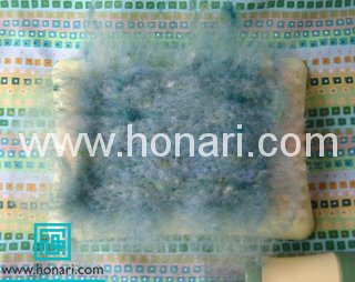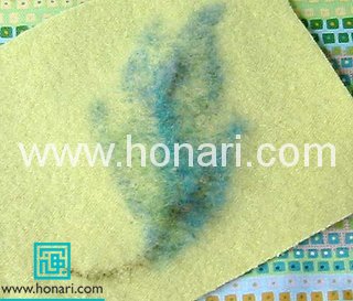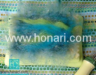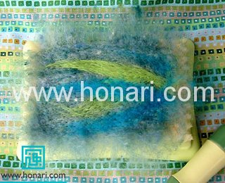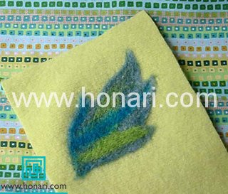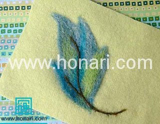 روشی که من استفاده کردم، باعث ایجاد طرح‌هایی محکم و فشرده شده است. معمولاً وقتی با سوزن کار می‌کنیم، الیاف پشم مستقیماً روی پارچه قرار گرفته و در جای خود سوراخ ایجاد می‌شود.