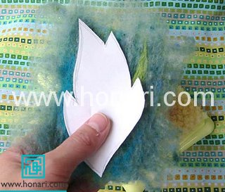 یک برگ کاغذی را با قیچی به شکل یک برگ درخت برش می‌زنم. سپس الیاف را روی آن قرار می‌دهم و قسمت‌های اضافی الیاف را هم قیچی می‌کنم تا کاملاً شبیه به یک برگ شود.